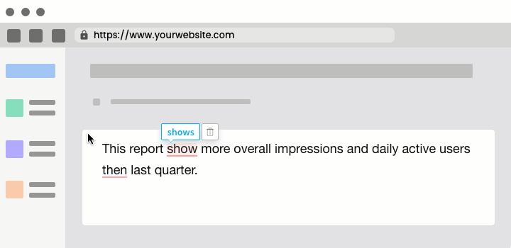 The Perfect Tense JavaScript library handles all the logic for sending text and underlining mistakes as a user is typing. All you need to do is add the following JavaScript to your website, and you will have intelligent spelling, grammar, and punctuation correction exactly where you need it.